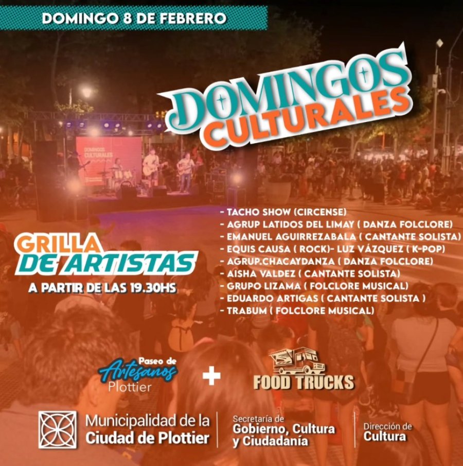 La ciudad de Plottier vivirá una nueva jornada de encuentro y celebración cultural con una nueva edición de Domingos Culturales, que se realizará el domingo 8 de febrero, a partir de las 19.30 horas, con entrada libre y gratuita.